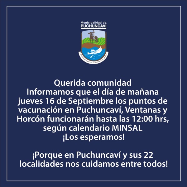 Se informa a nuestra comunidad que mañana jueves 16 de septiembre, los tres vacunatorios de la comuna atenderán hasta las 12:00 horas.