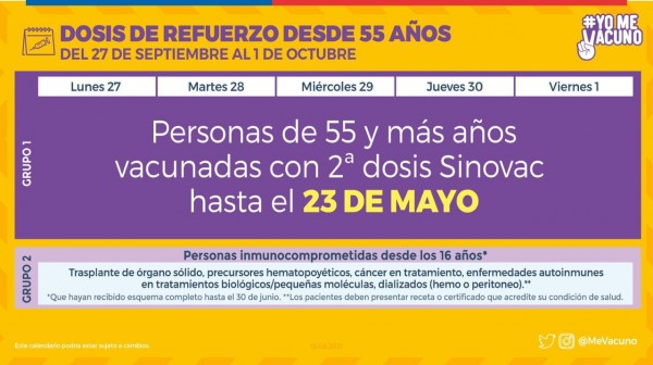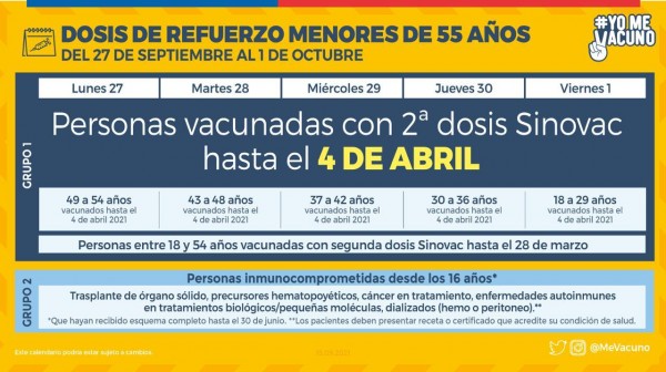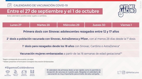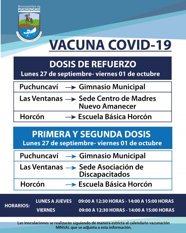 Informamos los puntos de vacunación y horarios de funcionamiento, para las personas que les corresponde vacunarse contra el COVID19, en la semana del lunes 27 de septiembre al viernes 1 de octubre . Se solicita respetar los calendarios establecidos por el Ministerio de Salud.