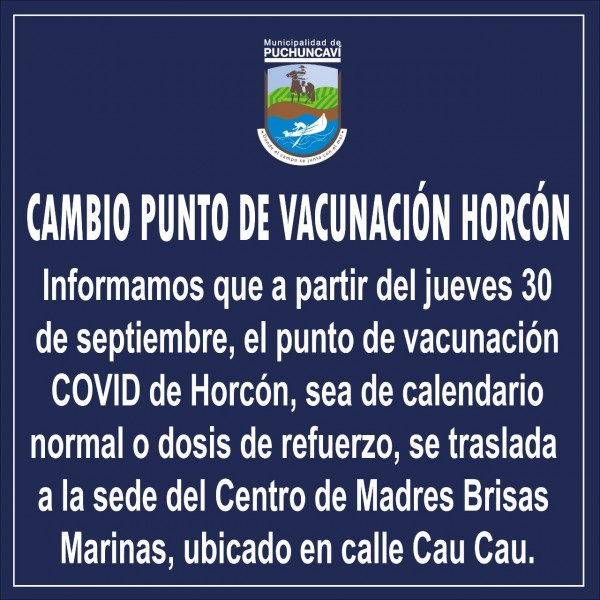 Estimados vecinos, informamos que el punto de vacunación COVID de Horcón, a partir de hoy jueves 30 de septiembre, se traslada al Centro de Madres Brisas Marinas, ubicado al final de Calle Caucau (a un costado del condominio Caucau).