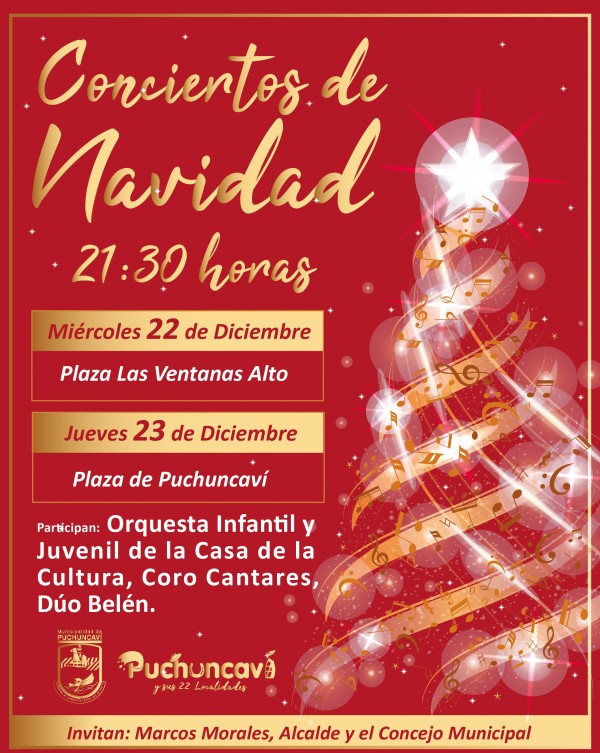 Miércoles 22 en la Plaza de Las Ventanas Alto y jueves 23 de diciembre en la Plaza de Puchuncaví, a partir de las 21:30 horas, se presentarán la Orquesta Infantil y Juvenil de la Casa de la Cultura, el Coro Cantares y el Dúo Belén.