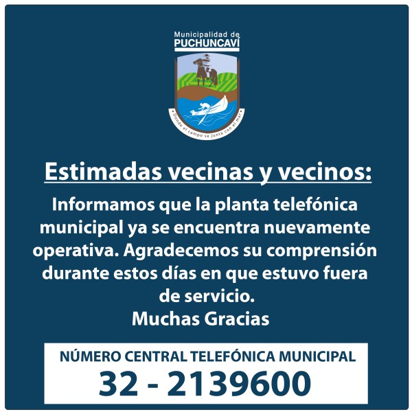 Informamos que la Central Telefónica Municipal se encuentra nuevamente operativa y que para comunicarse con los distintos departamentos y unidades municipales puede conocer los contactos en nuestra página web municipal.