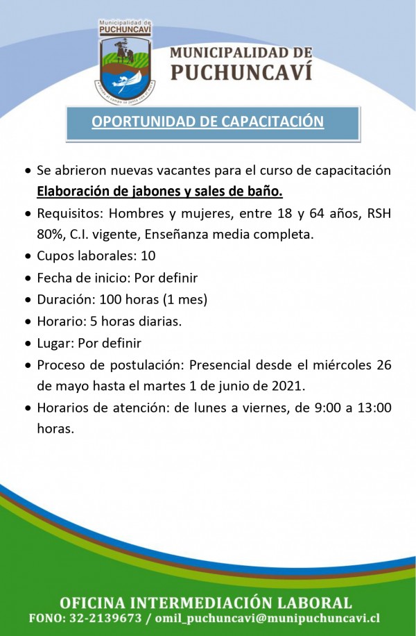 Mayores informaciones en imagen adjunta o llamando a la Oficina de Intermediación Laboral al fono 322139673.