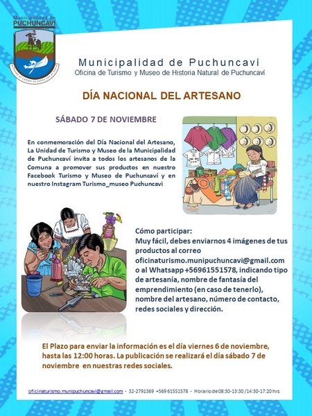 Con motivo de la Conmemoración del Día Nacional del Artesano, la Municipalidad de Puchuncaví, a través de su Unidad de Turismo y Museo, entregará un espacio para apoyar y promover a los artesanos y artesanas emprendedoras de nuestra comuna.