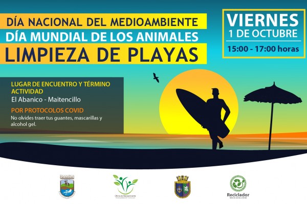 En el marco del Día Nacional del Medioambiente y el Día Mundial de los Animales, te invitamos a ser parte de la Limpieza de Playa que realizaremos este viernes 01 de octubre, de 15 a 17 horas, en el sector El Abanico de Maitencillo.