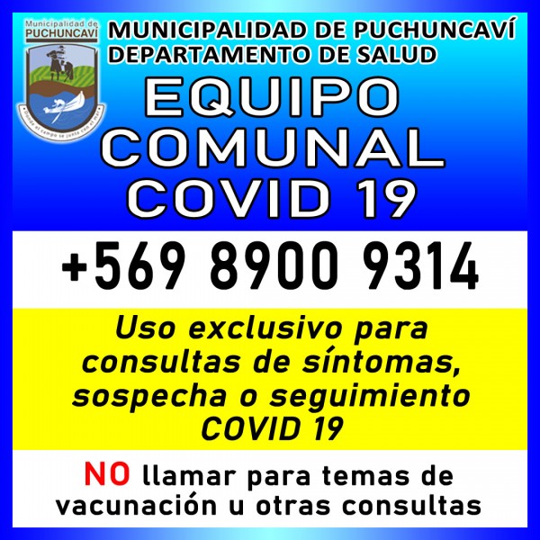 Es por lo anterior que el Departamento de Salud solicita a la comunidad, utilizar el contacto del Equipo Comunal Covid 19 sólo para casos de sospecha, síntoma o seguimiento de Covid y no para consultas de vacunación u otra índole, de manera que la línea pueda estar expedita para el llamado de algún vecino o vecina que se encuentre afectado o sospeche de estar afectado con el virus.