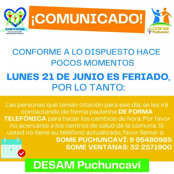 El Departamento de Salud informa a la comunidad, que debido a la reciente aprobación por parte del Congreso de decretar el lunes 21 de junio como feriado, habrá modificaciones en la atención de las personas que ya estaban citadas para dicho día, por lo que serán contactadas por funcionarios del departamento.
