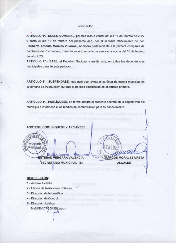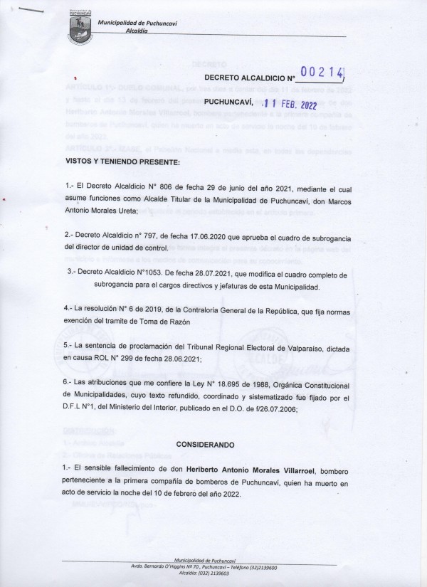 Considerando el sensible fallecimiento de nuestro querido Heriberto Antonio Morales Villarroel, voluntario perteneciente a la Primera Compañía de Bomberos de Puchuncaví, quién ha fallecido en acto de servicio el día 10 de febrero del año 2022, nuestro alcalde Marcos Morales Ureta ha decretado lo siguiente: