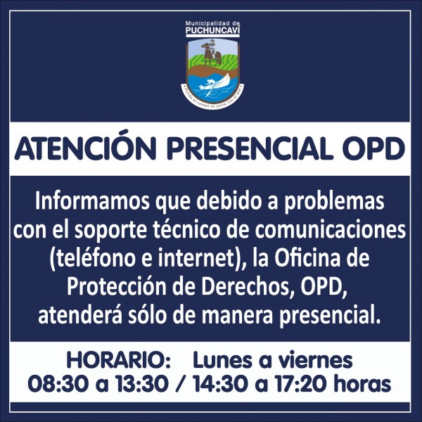 Informamos a nuestra comunidad que la Oficina de Protección de Derechos, OPD, no cuenta con plataforma técnica por el momento para atención a través de redes sociales o llamados telefónicos, por lo que no se utilizarán dichos medios hasta lograr reestablecer el servicio.