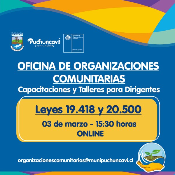Este jueves 3 de marzo, a las 15:30 horas, de forma remota, se desarrollará la primera Capacitación para Dirigentes denominada “Ley 19.418 y Ley 20.500”, enmarcada en el trabajo que desarrolla la Oficina de Organizaciones Comunitarias de nuestro Municipio.