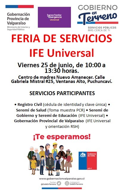 Se informa a la comunidad que mañana viernes 25 de junio, se realizará una Feria de Servicios, en la sede del Centro de Madres Nuevo Amanecer de Las Ventanas, donde participarán los servicios Registro Civil, Seremi Salud, Seremi de Gobierno, Seremi de Educación y la Gobernación Provincial.