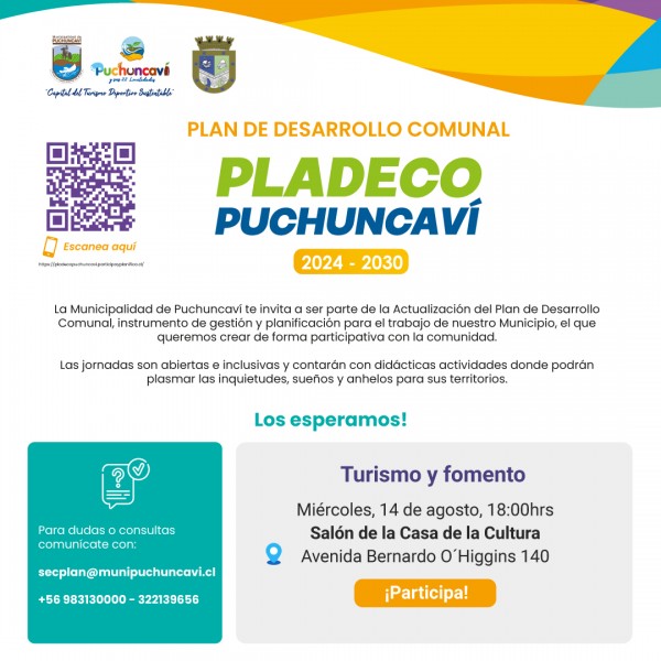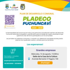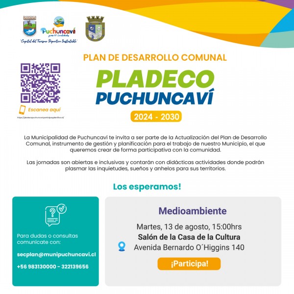 Continuando con el trabajo de Actualización del Plan de Desarrollo Comunal para Puchuncaví 2024 - 2030, invitamos a la comunidad a participar de los talleres temáticos que se están llevando a cabo (se adjuntan gráficas) y que en esta próxima semana corresponden a: