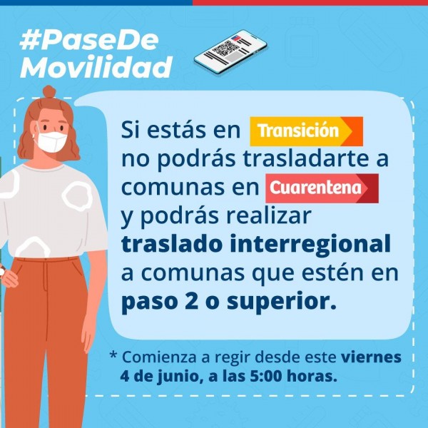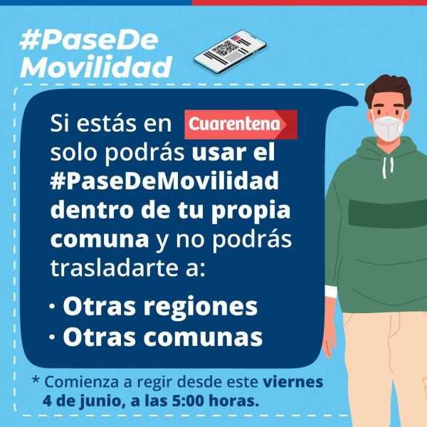 Se informa a la comunidad que de acuerdo a lo anunciado por la Autoridad Sanitaria, el Pase de Movilidad contará con las siguientes características a partir de mañana viernes 04 de junio a las 05:00 horas.