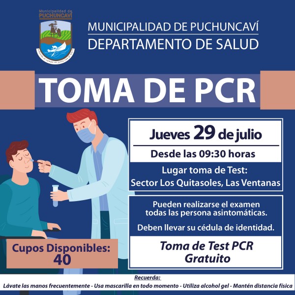 Informamos a la comunidad que mañana jueves 29 de julio, nuestro Departamento de Salud Municipal, realizará un nuevo operativo de toma de muestras PCR, esta vez en Las Ventanas.