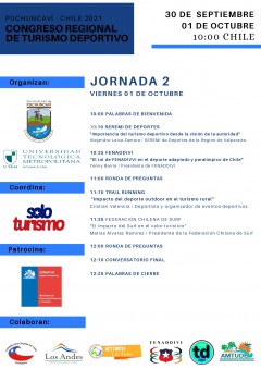 En las imágenes, adjuntamos la programación de cada una de las jornadas, donde contaremos con expositores locales y regionales, con quienes analizaremos los beneficios de la unión del Turismo y el Deporte, como polo de desarrollo comunal.