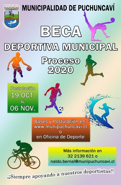 Recuerde, hasta el viernes 06 de noviembre estarán abiertas las postulaciones a la Beca Deportiva Municipal de forma presencial o a través de nuestra página web. Para mayores informaciones sobre el proceso de este año puede acercarse a la Oficina de Deporte del Municipio, llamar al fono 322139621 o escribir al correo naldo.bernal@munipuchuncavi.cl