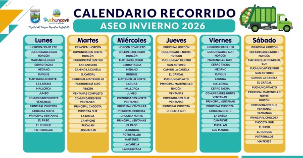 Desde el pasado 6 de abril de 2026, se encuentra en funcionamiento el recorrido de los camiones de recolección de residuos domiciliarios correspondiente al periodo invernal en la comuna de Puchuncaví, con el objetivo de brindar un servicio más ordenado, eficiente y acorde a las necesidades de la comunidad.