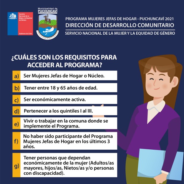 Hasta este jueves 15 de julio se podrán inscribir para participar en el Programa Mujeres Jefas de Hogar Puchuncaví 2021, programa que busca entregar herramientas para la empleabilidad de nuestras mujeres, en trabajos dependientes o independientes.