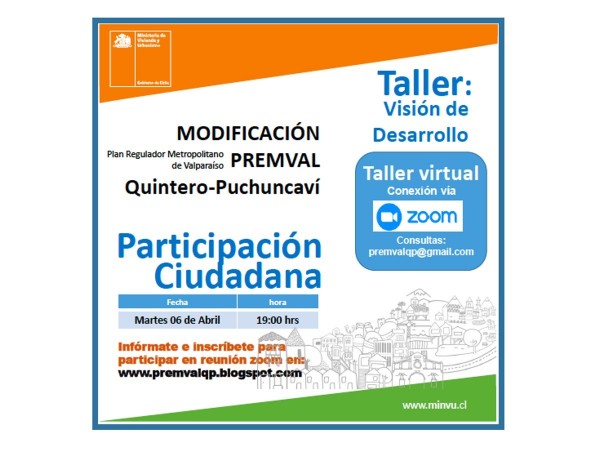 El Ministerio de Vivienda y Urbanismo invita a la comunidad a a participar del Taller online "Visión de Desarrollo" en el marco de la modificación del Plan Regulador Metropolitano Valparaíso, PREMVAL.