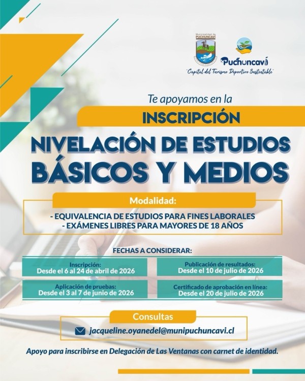 La Municipalidad de Puchuncaví informa a la comunidad que se encuentran abiertas las inscripciones para el proceso de nivelación de estudios básicos y medios, una importante iniciativa dirigida a personas mayores de 18 años que deseen completar su formación académica.