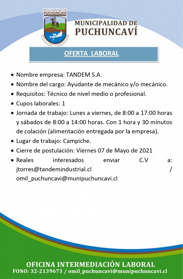 Mayores informaciones en imágenes adjuntas. Para cualquier consulta sobre la postulación a este cargo puede comunicarse con la OMIL de nuestro municipio al fono 322139673.
