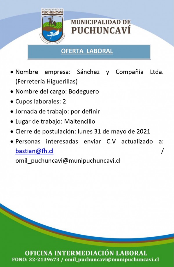 Se informa a la comunidad de cupo laboral para el cargo de bodeguero en ferretería de Maitencillo.