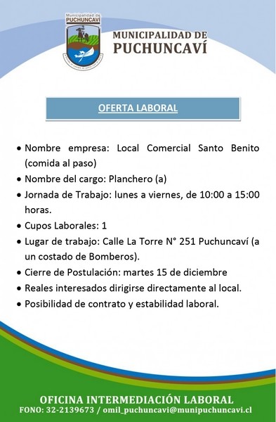 Nueva oferta laboral recibida por la Oficina de Intermediación Laboral a la que podrá postular hasta el martes 15 de diciembre.