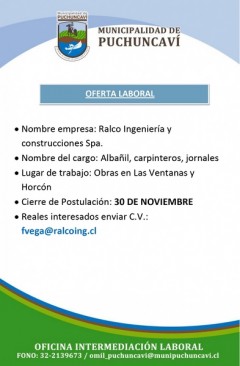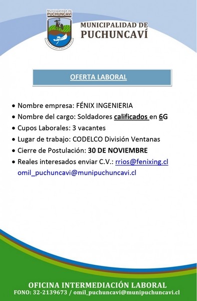 Nuevas ofertas laborales han sido recepcionadas por la OMIL de nuestro Municipio, las que ponemos a disposición de toda nuestra comunidad.