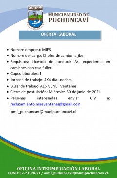 Informamos de dos nuevas ofertas recibidas por la OMIL. Se trata de Chofer para camión aljibe y Mecánico para maquinaria pesada a desempeñarse en empresa del sector de Las Ventanas.
