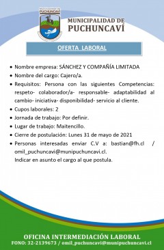 Se informa a la comunidad de tres nuevas ofertas laborales recepcionadas por la Oficina de Intermediación Laboral.