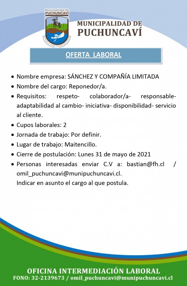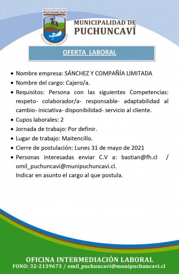 Se trata de cargos de Reponedor/a - Bodeguero Peoneta - Cajero/a para trabajar en la localidad de Maitencillo.
