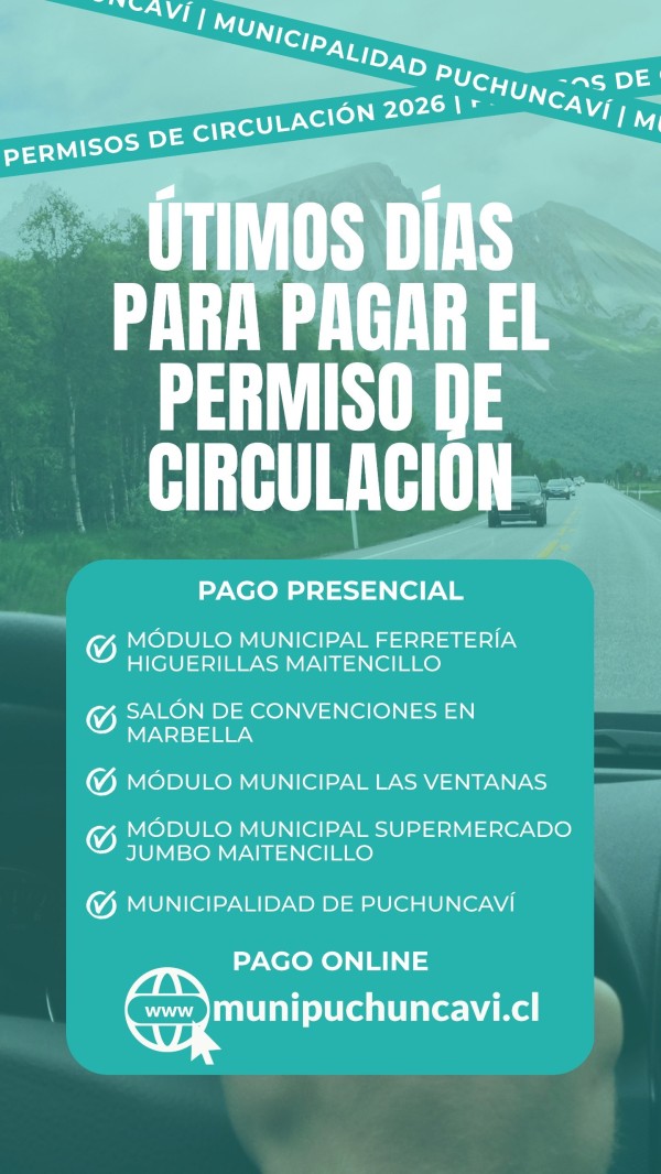 Durante los sábados y domingos del mes de marzo, entre las 09:00 y las 19:30 horas, contaremos con atención especial para el pago presencial del Permiso de Circulación 2026, facilitando así el proceso para todos nuestros vecinos.