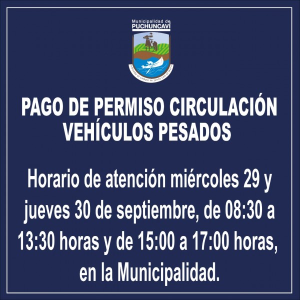 Informamos que hoy miércoles 29 y mañana jueves 30 de septiembre, se extenderá el horario de atención para el pago del Permiso de Circulación de Vehículos Pesados.