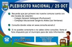 Este 25 de octubre, en el Plebiscito Nacional 2020, nuestra comuna contará con dos locales de votación, por eso es muy importante que antes de ir a sufragar, consulte a través de www.servel.cl o del fono municipal 322139682, cuál es su circunscripción electoral.
