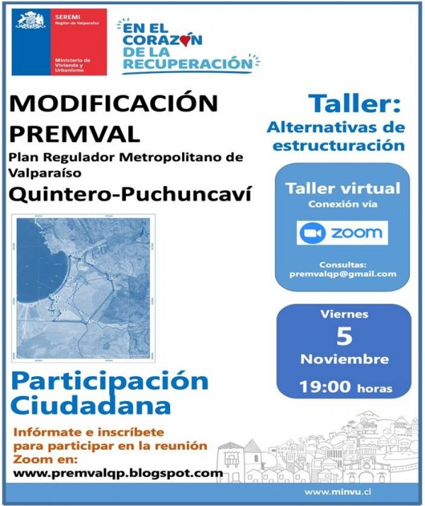 Porque la participación ciudadana es importante en el ordenamiento de su territorio, informamos a nuestra comunidad sobre el Taller abierto a la Ciudadanía que se realizará en el marco de la modificación del Plan Regulador Metropolitano Valparaíso, PREMVAL.
