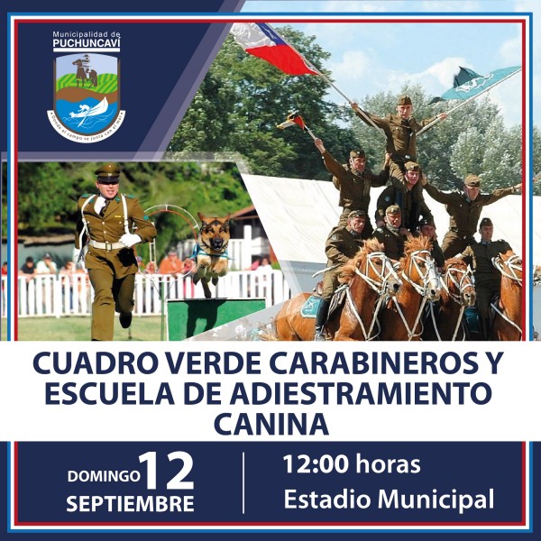 Se trata de la presentación del Cuadro Verde de Carabineros y la Escuela de Adiestramiento Canina de Carabineros que mostrarán su espectáculo de primer nivel, en el marco de las Celebraciones de nuestro Mes Aniversario Comunal y Fiestas Patrias.