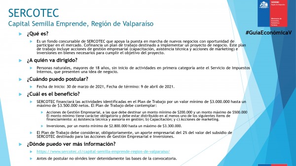 Sercotec informa que ya se encuentran abiertas las postulaciones para el programa “Capital Semilla Emprende”, el que entrega un aporte máximo de $ 3.500.000, el que busca apoyar la puesta en marcha de nuevos negocios con oportunidad de participar en el mercado.