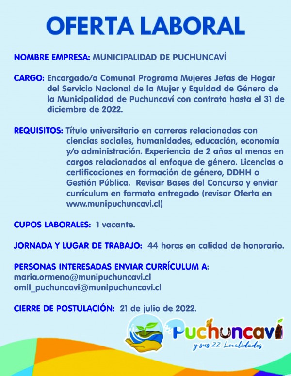 Informamos de nueva convocatoria para reclutar a Profesional para el cargo de Encargado Comunal del Programa Jefas de Hogar de Puchuncaví, con contrato hasta el 31 de diciembre de 2022.