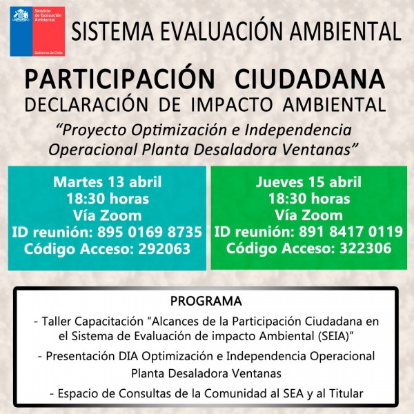 Se informa a la comunidad que el Servicio de Evaluación Ambiental invita a participar de talleres y espacios de consultas que realizará con motivo de la Declaración de Impacto Ambiental del Proyecto "Optimización e Independencia Operacional Planta Desaladora Ventanas".