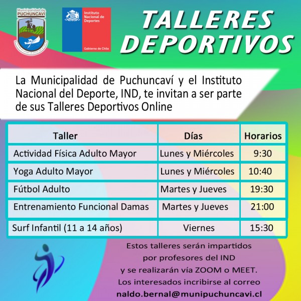 En tanto, para participar en los talleres gestionados con el IND, deben hacer llegar un correo electrónico a naldo.bernal@munipuchuncavi.cl con su nombre, rut, fono de contacto y disciplina en la que quiere participar para hacerle llegar el link de acceso a la clase elegida.