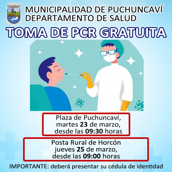 Se informa a la comunidad que esta semana las tomas de muestras PCR por parte del Departamento de Salud Municipal se realizarán en Puchuncaví y Horcón.