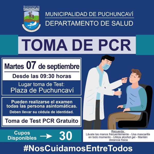 Informamos a la comunidad que mañana martes 07 de septiembre, en la plaza de Puchuncaví, a partir de las 09:30 horas, nuestro Departamento de Salud Municipal, realizará una nueva toma de muestras PCR de manera de pesquisar posibles casos asintomáticos de covid 19.
