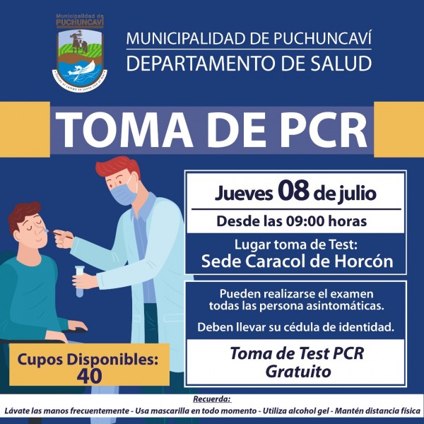 Informamos de nuevo operativo de toma de muestras PCR gratuito para la comunidad, que desarrollará el Departamento de Salud de nuestro Municipio.