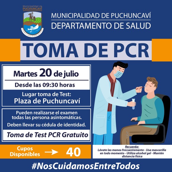 Informamos a la comunidad que mañana martes 20 de julio, el Departamento de Salud Municipal, realizará un operativo de toma de muestras PCR en la plaza de Puchuncaví.