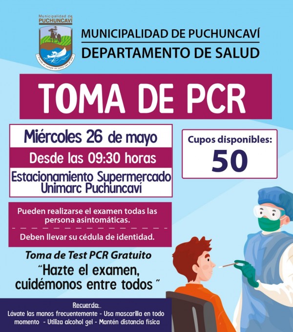 Informamos a la comunidad que mañana miércoles 26 de mayo, a partir de las 09:30 horas, en el estacionamiento del Supermercado Unimarc, el Departamento de Salud Municipal desarrollará un nuevo operativo de Toma de Muestras PCR a la población que lo desee.