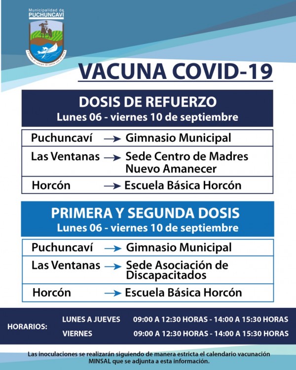 Estimados Vecinos, compartimos con Ustedes, los puntos de vacunación Covid 19, ya sea para dosis de refuerzo y primera y segundas dosis correspondiente a la semana del lunes 06 al viernes 10 de septiembre.