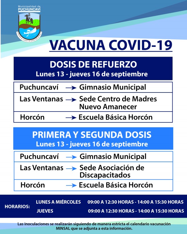 Informamos a la comunidad los puntos de vacunación Covid 19, ya sea para dosis de refuerzo y primera y segundas dosis correspondiente a la semana del lunes 13 al jueves 16 de septiembre.