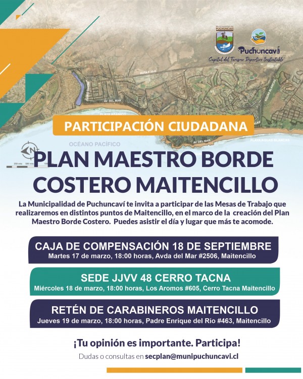 La Municipalidad de Puchuncaví invita a la comunidad a participar de las mesas de trabajo que se realizarán en el marco de la creación del Plan Maestro Borde Costero de Maitencillo, desde el 17 y hasta el 19 de marzo.
